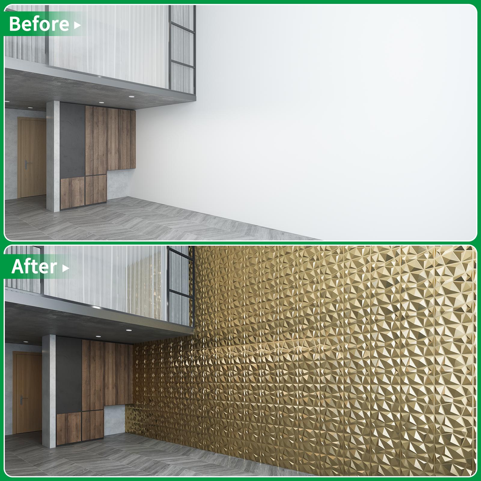 Each box contains 33 panels that can cover an area of 3 m² or 32 sq.ft. Fashionable glue on wall embossed 3D wall covering manufacturer direct, cheap price and good quality, can be used in exterior wall covering and interior wall design.