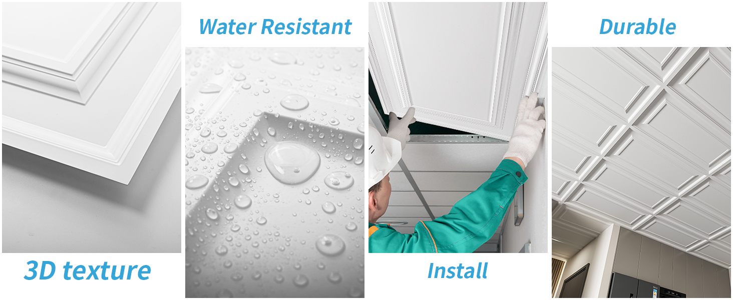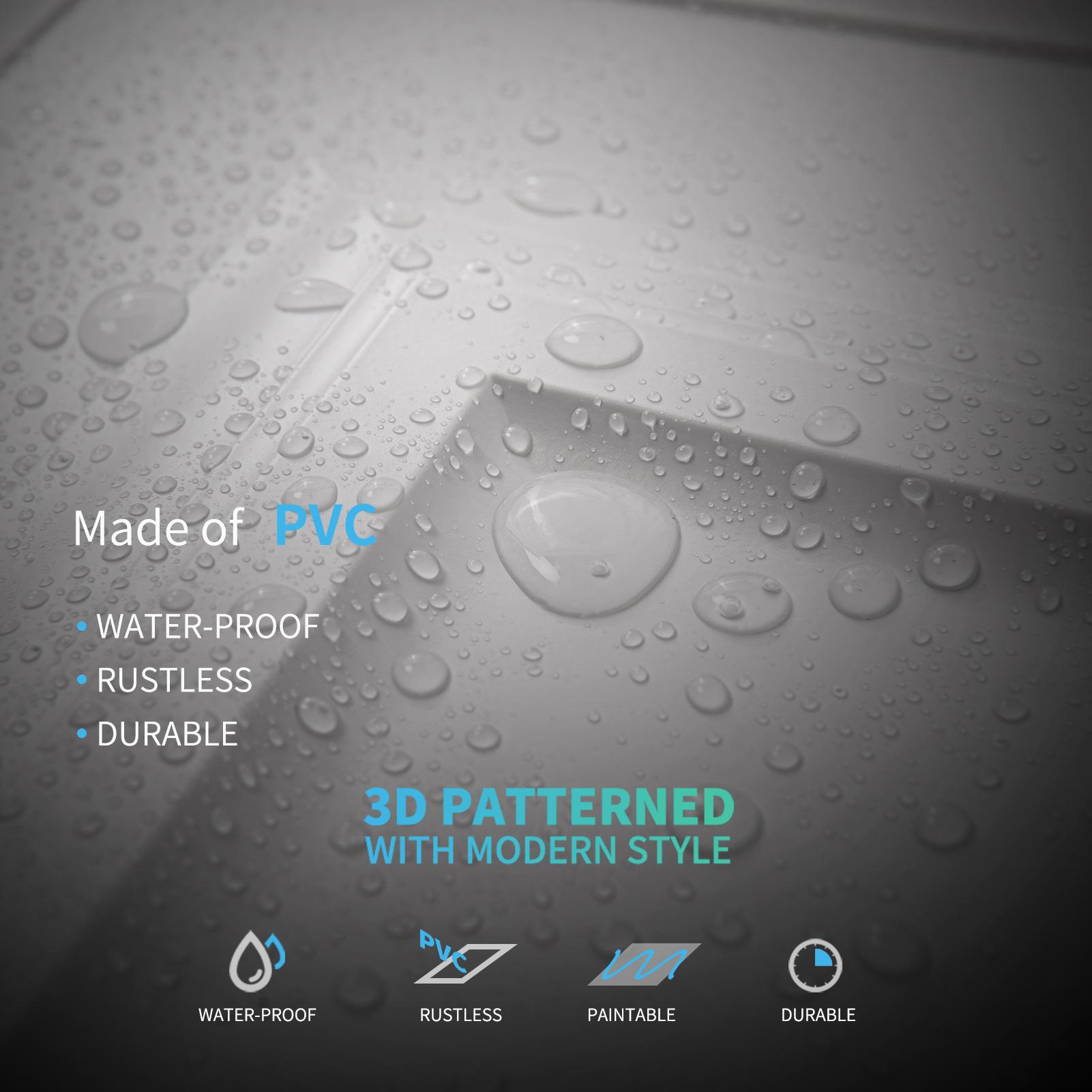 Material - Made from high-quality PVC, these ceiling tiles are not only durable and sleek but also waterproof and flexible, ensuring a perfect blend of functionality, resilience and aesthetics