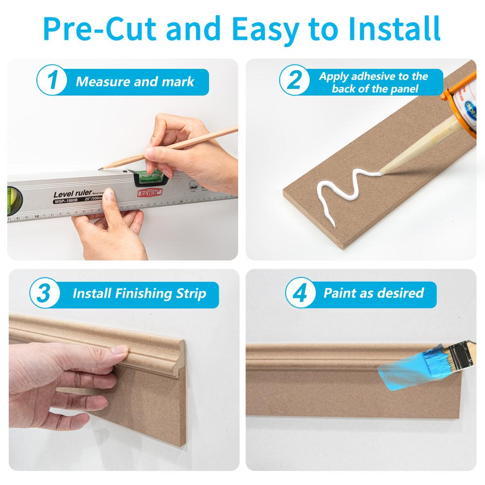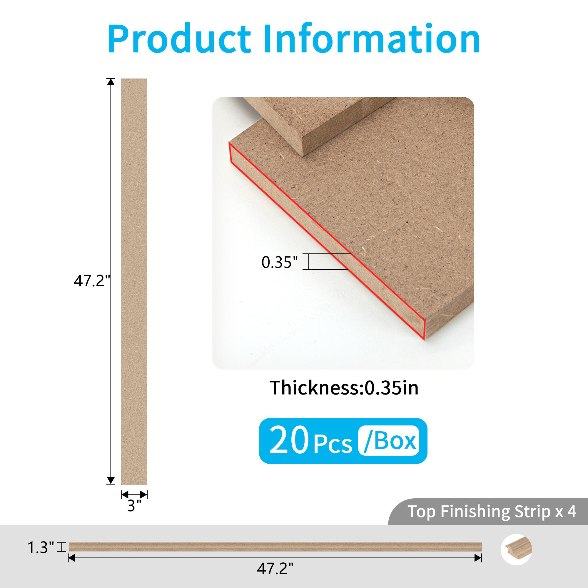 All-in-One Design - Package of 20 premade molding trim slat + 4 decorative edge strip create instant board & batten walls Edge Strips for Added Detail – Comes with an additional shelf edge trim for a more polished and sophisticated look Versatile DIY – Install wainscoting kit by applying constructive glue to create a stylish accent wall. Ideals for living room, hallway and more Paint for any Style - It comes with raw MDF panel, easy to paint your favorite color to match your room's decor Durable Material – The MDF panels are designed to withstand wear and tear, providing long-lasting performance USA Free Shipping