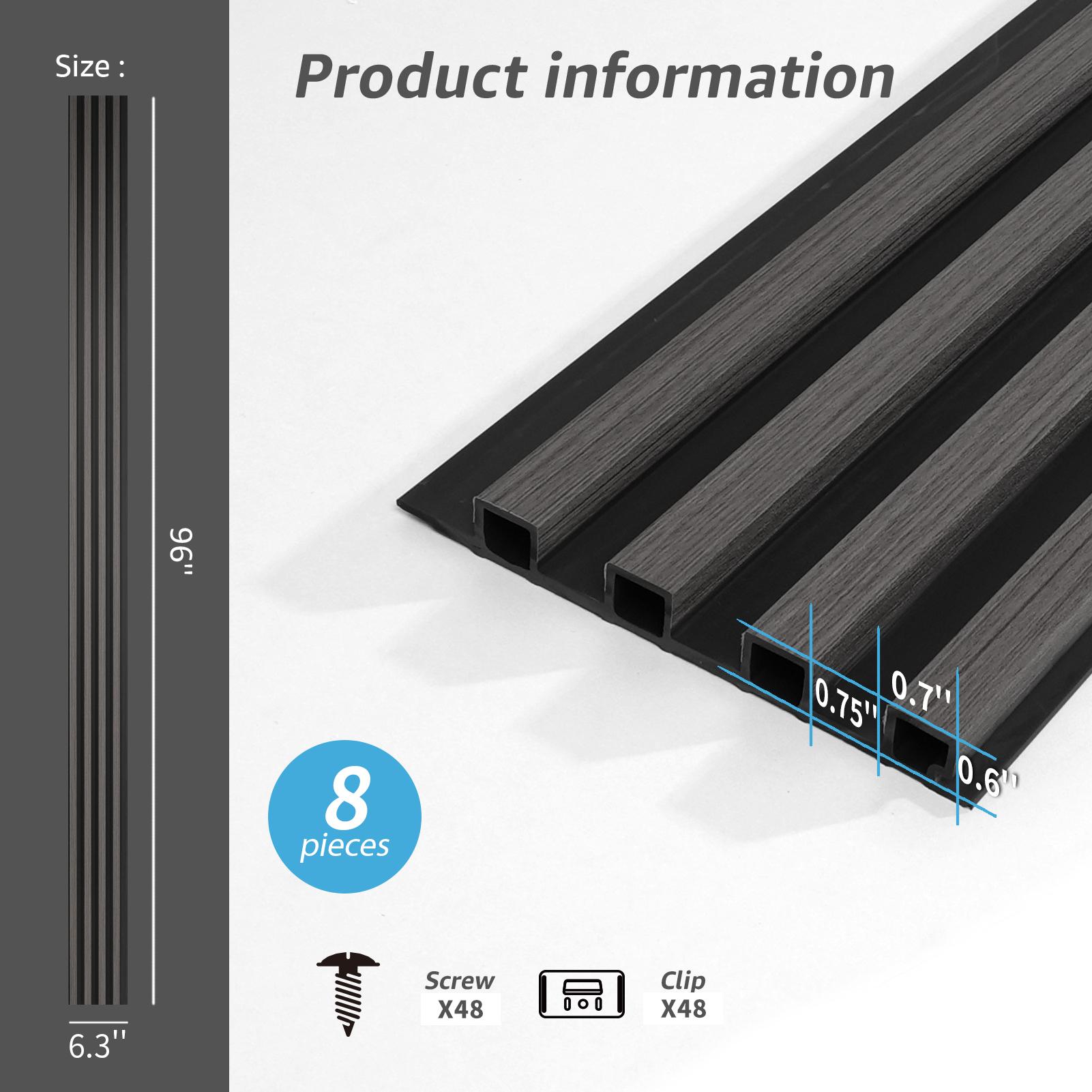 Complete Package - Includes 8 WPC fluted wall panels, each measuring 96 x 6 inches, covering 32 square feet area. Along with an installation kit featuring clips and screws for easy and secure installation