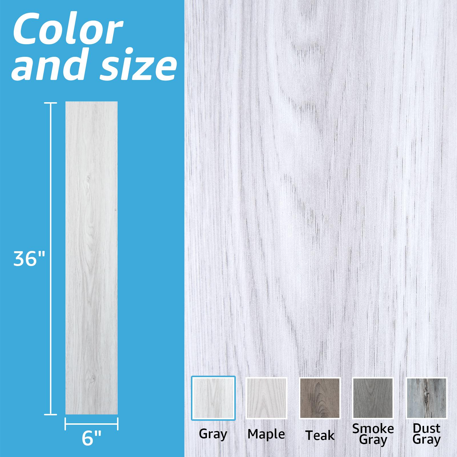 Size: Self adhesive floor tiles the size of each piece is 36 x 6 inch. 10 pieces can cover 15 sq.ft.